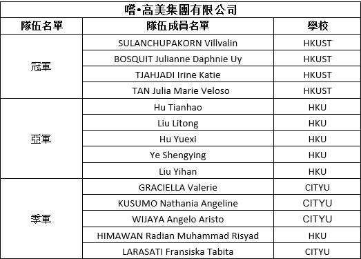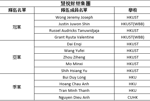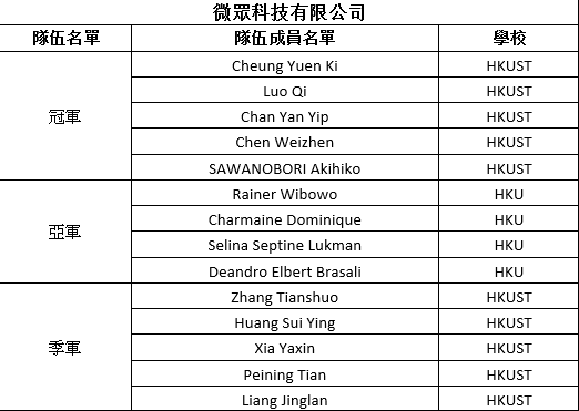 本次「GATEWAY TO TOMORROW 智啟未來」比賽共吸引超過1600名大專學生、334支隊伍報名參賽,參賽隊伍隨機分為微眾科技有限公司、嚐•高美集團有限公司或慧悅財經集團組別,以真實企業AI轉型為題,針對企業發展策略提出具體方案。在經過初賽和決賽的層層選拔後,三個組別各有5支隊伍進入前5名獲得獎項。微眾科技有限公司、嚐•高美集團有限公司、慧悅財經集團的冠、亞、季軍團隊分别是: